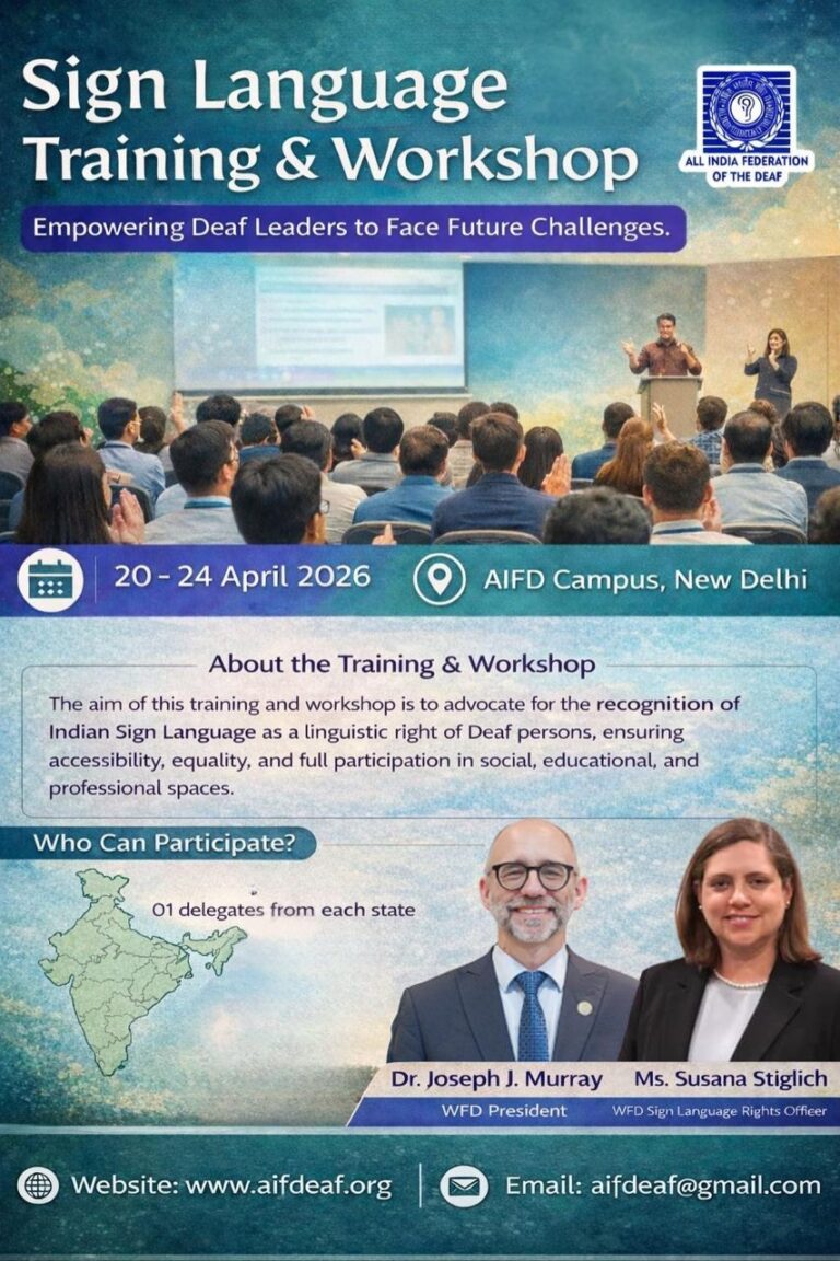 We are pleased to announce that the All India Federation of the Deaf (AIFD) is organizing the Sign Language Training Workshop from 20 to 24 April 2026 at AIFD Campus, New Delhi, India.